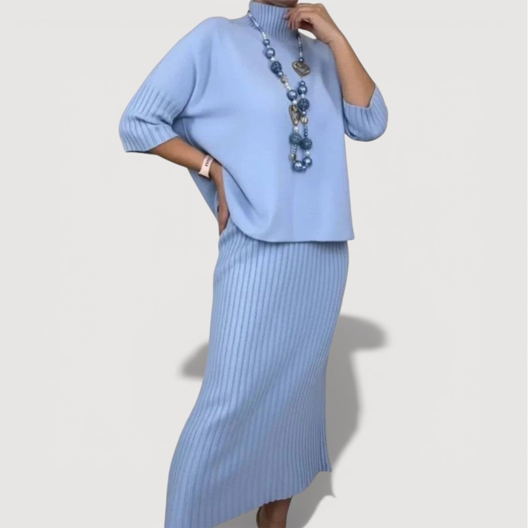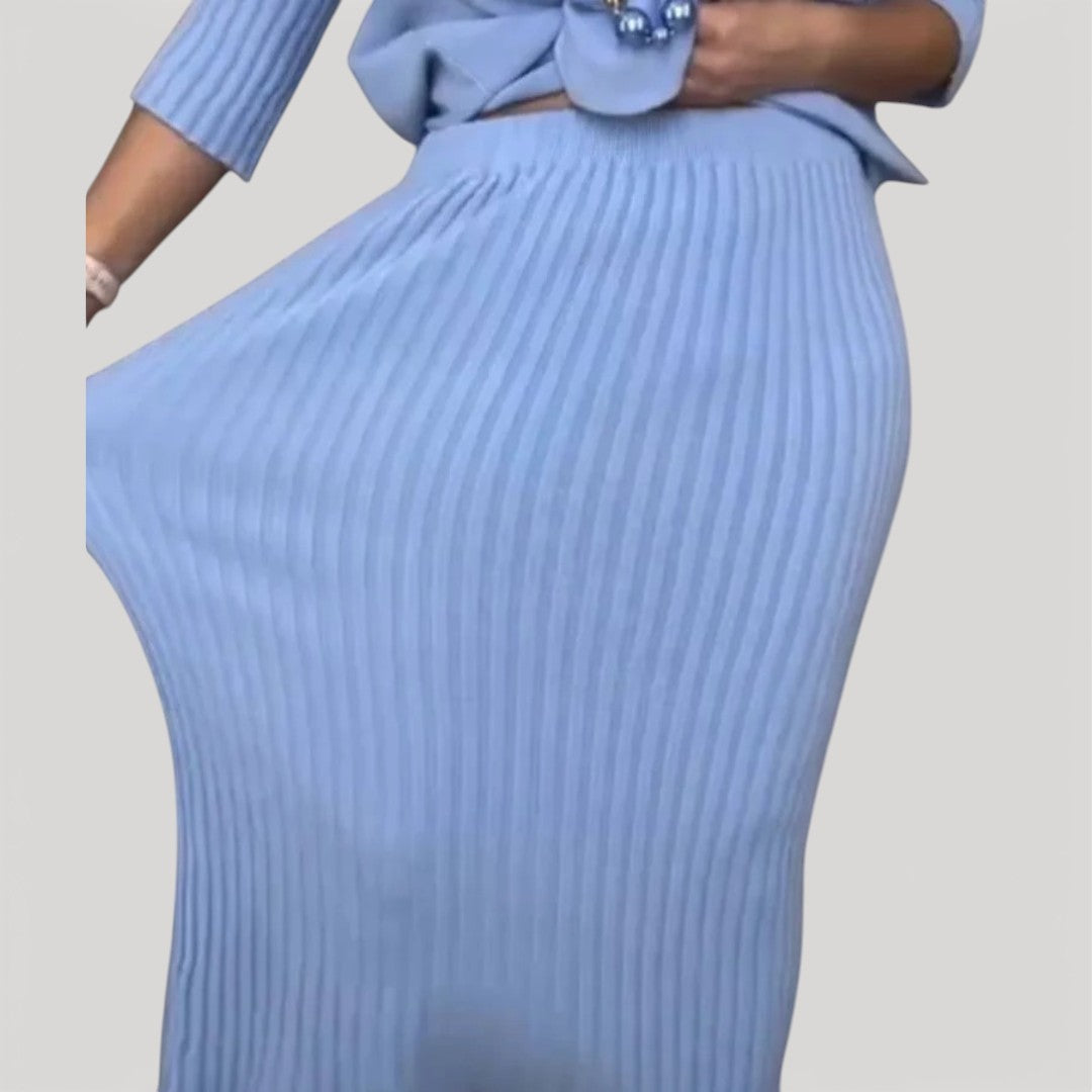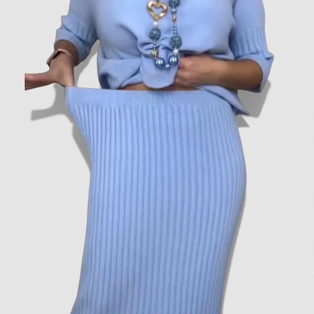 Orielle Refined Set is designed to bring effortless elegance into your everyday wardrobe. The softly draped knit top pairs beautifully with the coordinating ribbed midi skirt, creating a balanced silhouette that feels relaxed yet polished. Comfortable, flattering, and easy to wear, this two-piece set is ideal for days when you want to look put together without sacrificing ease.