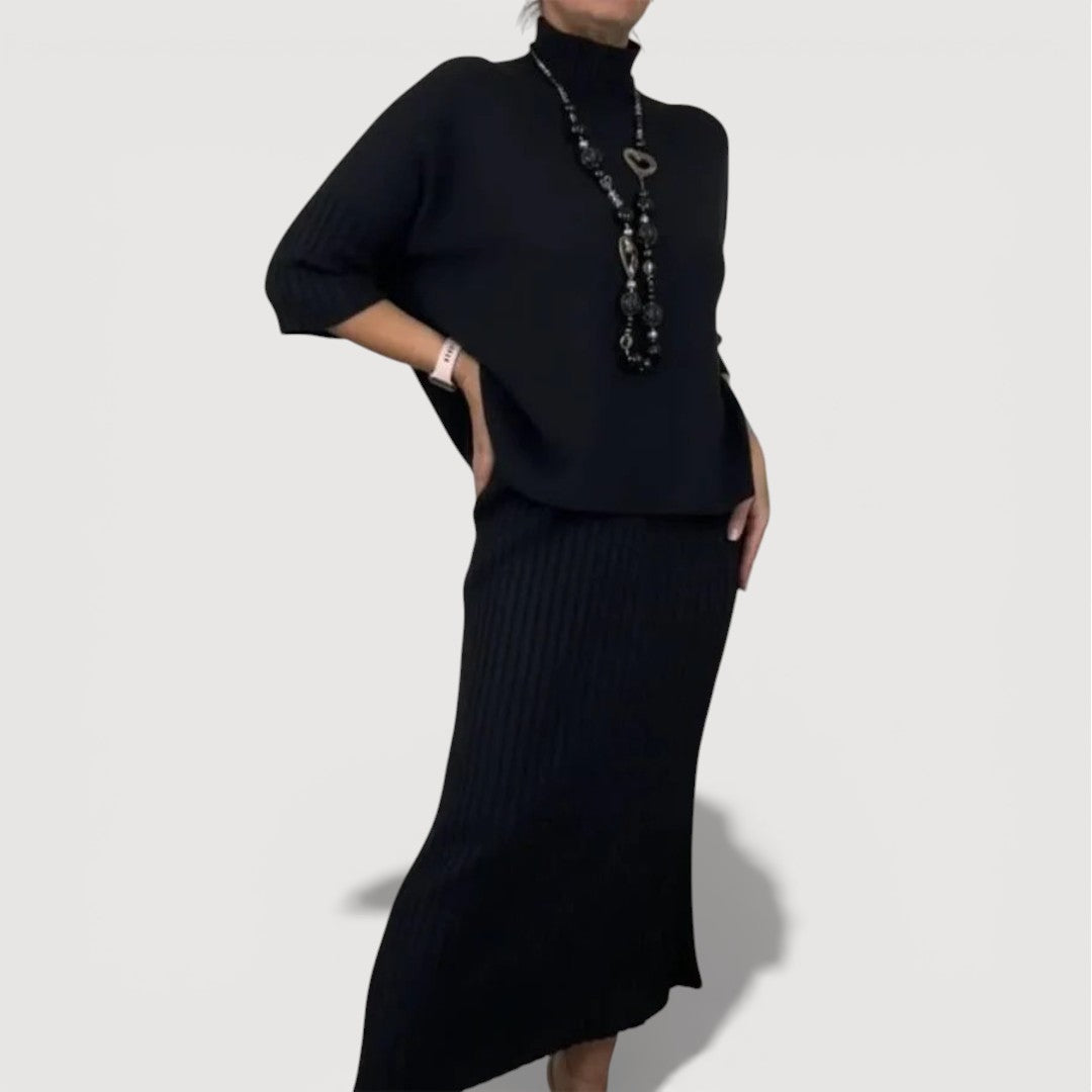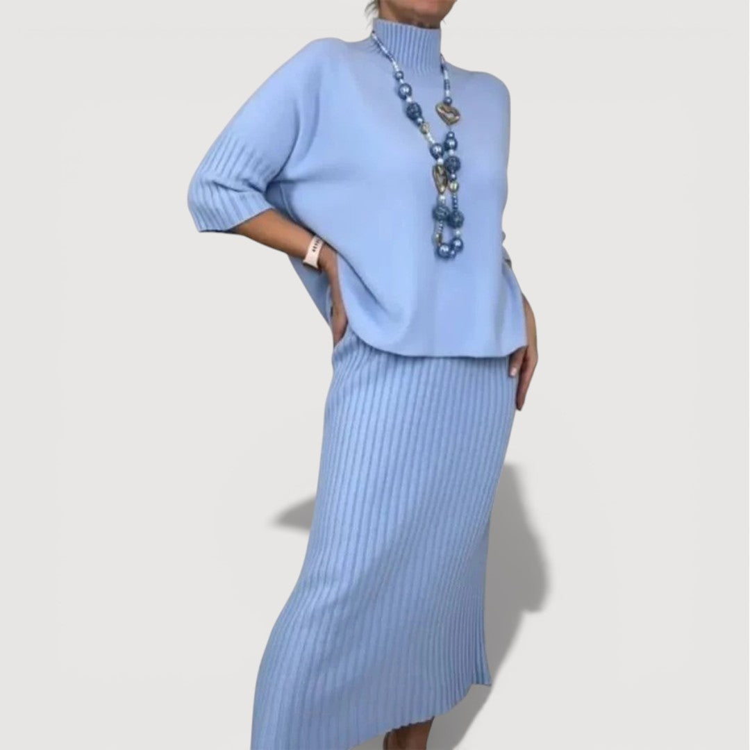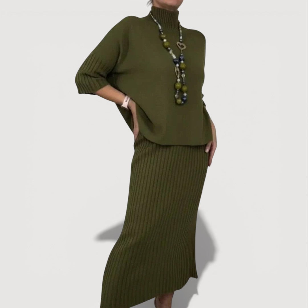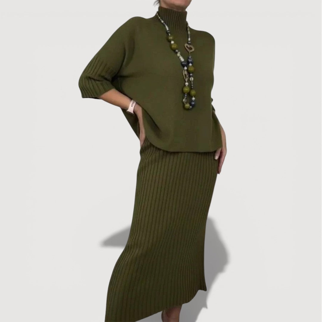 Orielle Refined Set is designed to bring effortless elegance into your everyday wardrobe. The softly draped knit top pairs beautifully with the coordinating ribbed midi skirt, creating a balanced silhouette that feels relaxed yet polished. Comfortable, flattering, and easy to wear, this two-piece set is ideal for days when you want to look put together without sacrificing ease.
